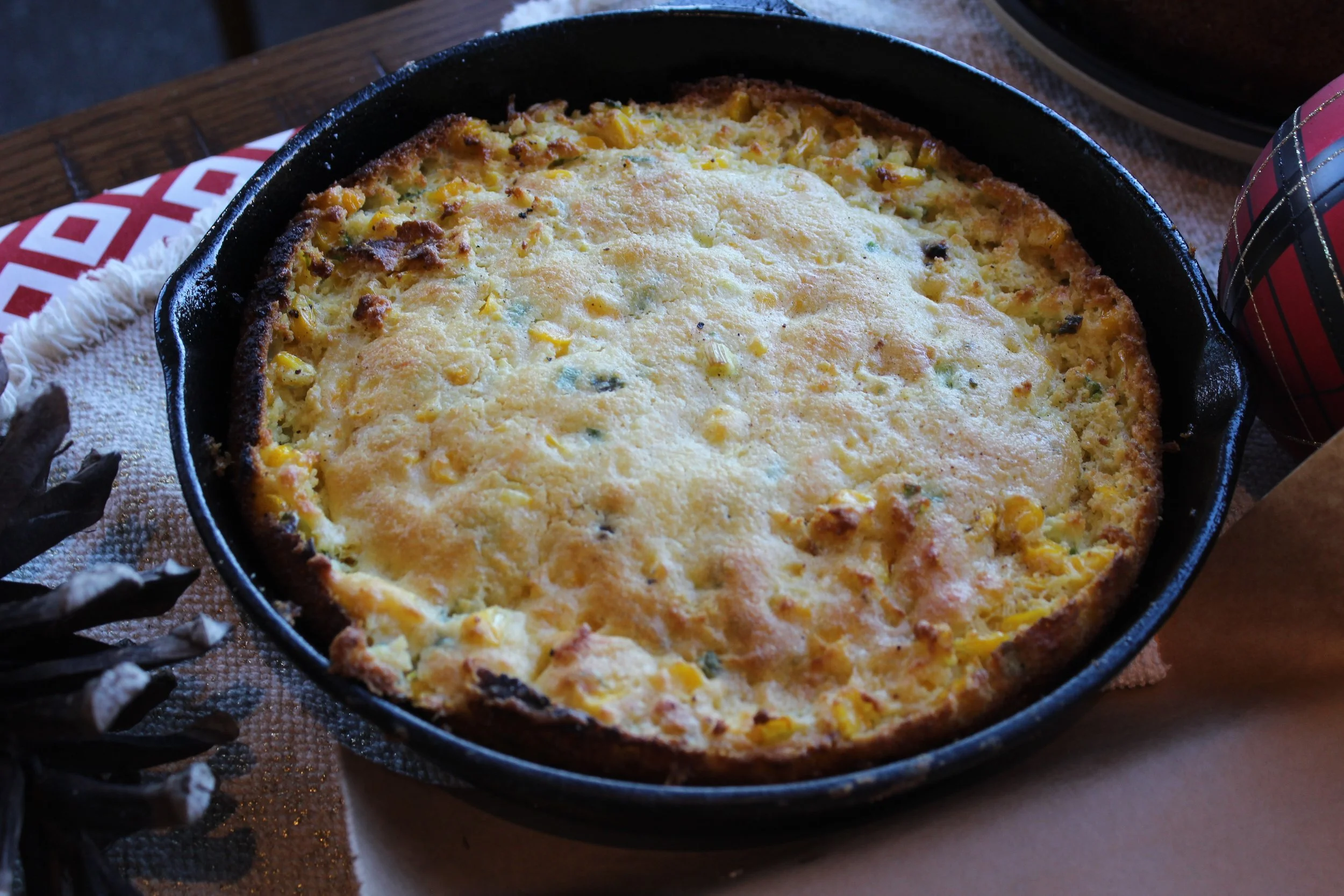 Sweet Corn Pudding with sour cream and scallions.